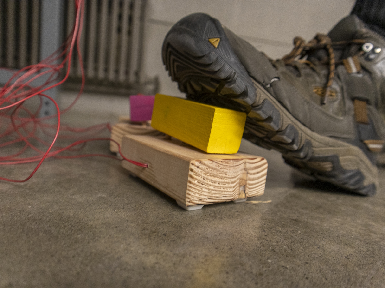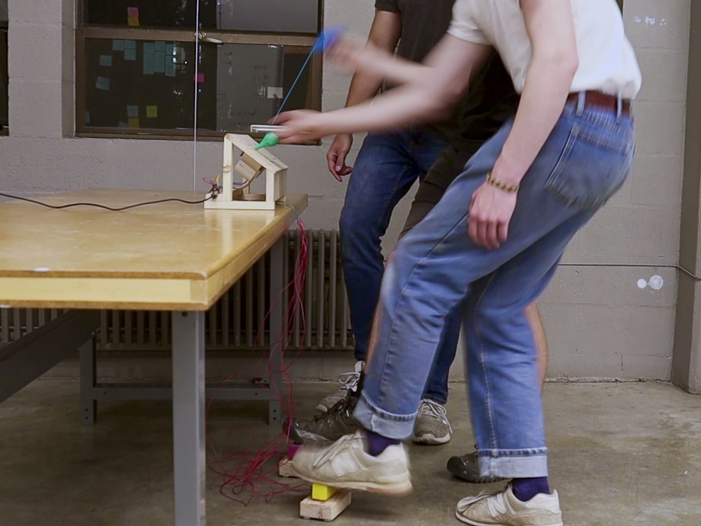 This project also prompted a process for instrument prototyping. In a workshop shown in the following video, participants pretended to “play” nearby large objects—like a recycling bin, a paper cutter, and a ladder—as though they were instruments. We used a keyboard to produce sounds that roughly mirror the movements they were making, and determined what movement-sound combinations were most interesting and realistic.